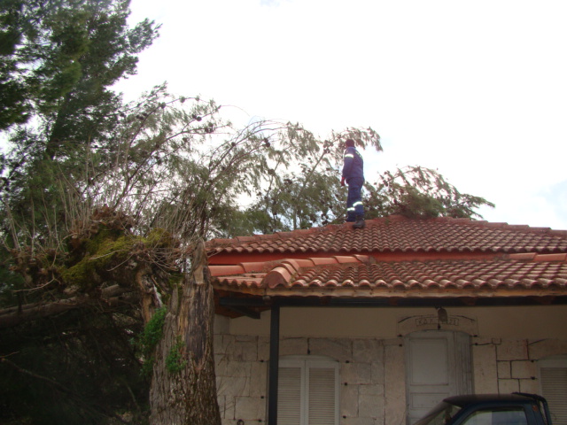 Στην πρώτη περίπτωση το μεσημέρι ένα μεγάλο πεύκο έπεσε πάνω στη στέγη του απέναντι σπιτιού του κ. Δημήτρη Καλόμαλλου προκαλώντας μικρές ζημιές σε κεραμίδια της στέγης και κλείνοντας ταυτόχρονα το δρόμο.